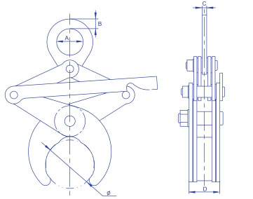 | 额定载荷 (t) | 适用范围 Φ (mm) | 设计开口 (mm) | A (mm) | B (mm) | C (mm) | D (mm) |