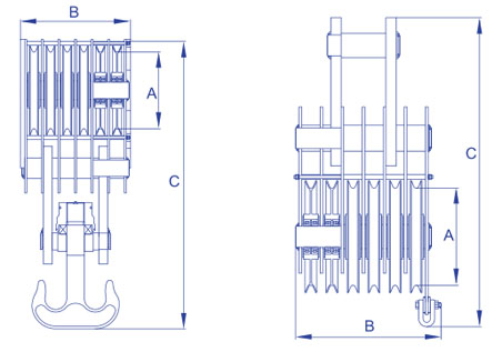 | 产品型号 | 名称 | 钢丝绳直径 (mm) | 额定载荷 (t) | A (mm) | B (mm) | C (mm) | 自重 (kg) |