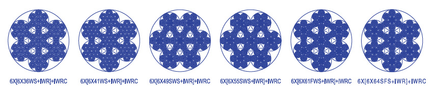 绳结构:6×[6x36WS+IWR]+IWRC 6×[6x36WS+41+IWR]+IWRC 6×[6x49SWS+41+IWR]+IWRC 6×[6x55SWS+IWR]+IWRC 6×[6x61FWS+41+IWR]+IWRC 6×[6x64SWS+41+IWR]+IWRC